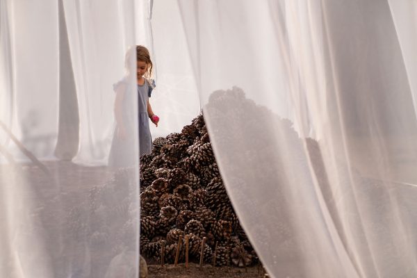 Instalación interactiva que invita al juego libre e imaginativo en un entorno cambiante hecho de materiales naturales. Ubicada en un espacio urbano, fomenta una interacción pausada y táctil, reflexionando irónicamente sobre la esencia del juego infantil y la cultura del sobreconsumo. Nami Nami Studio Patio COAR Intervención
