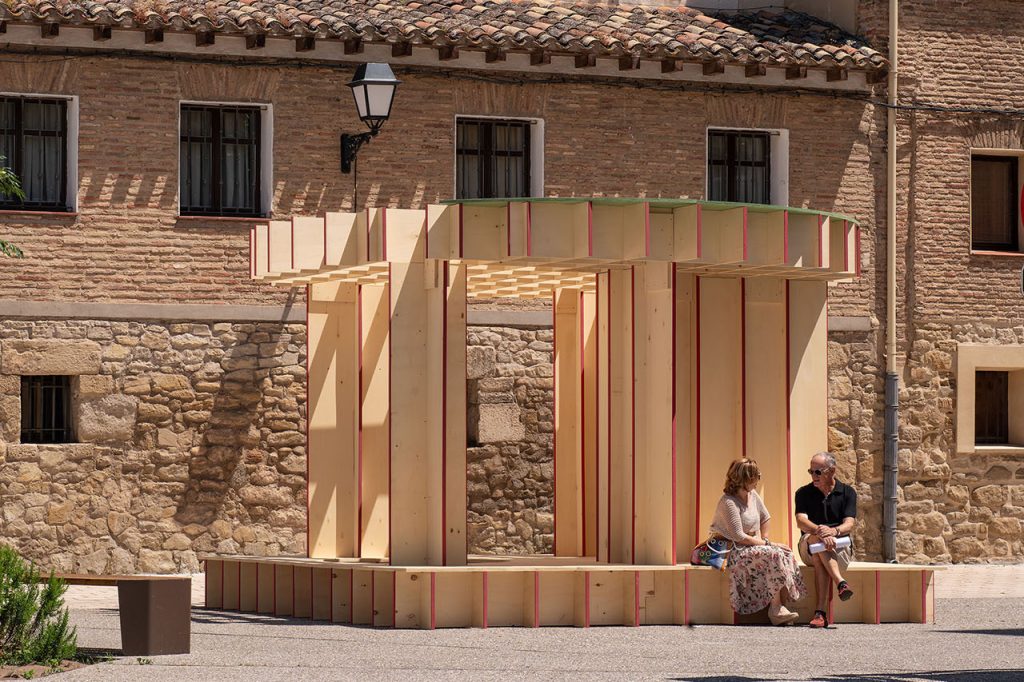 La intervención es una serie de espacios circulares que, inspirados en el top corto, combinan encuadre visual y estructural mediante superficies parciales que recortan vistas y minimizan materiales para resaltar lo ausente. BairBalliet Plaza Cofradía del Vino Rioja Instalación