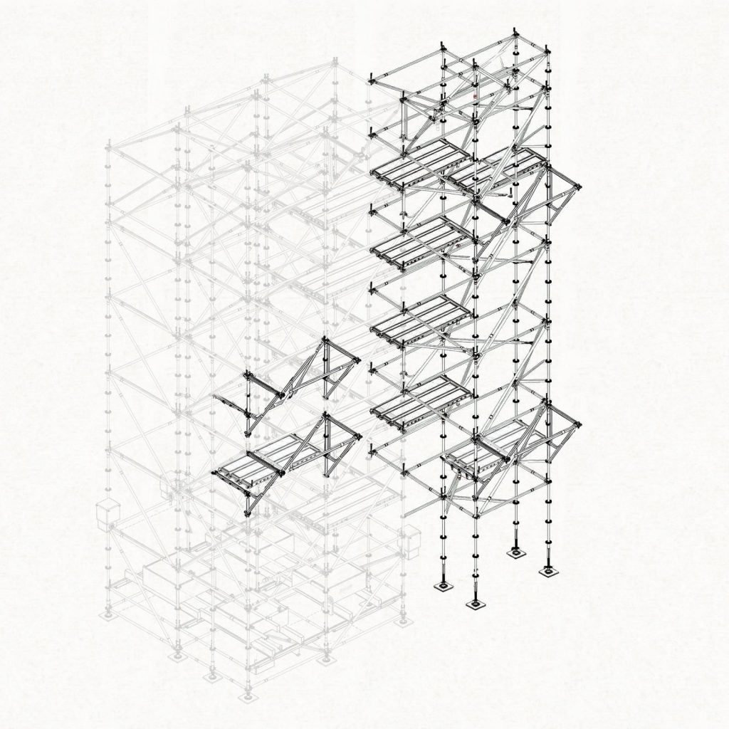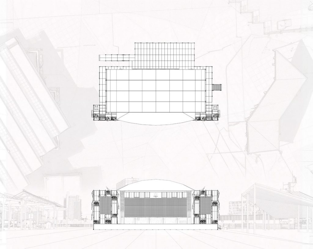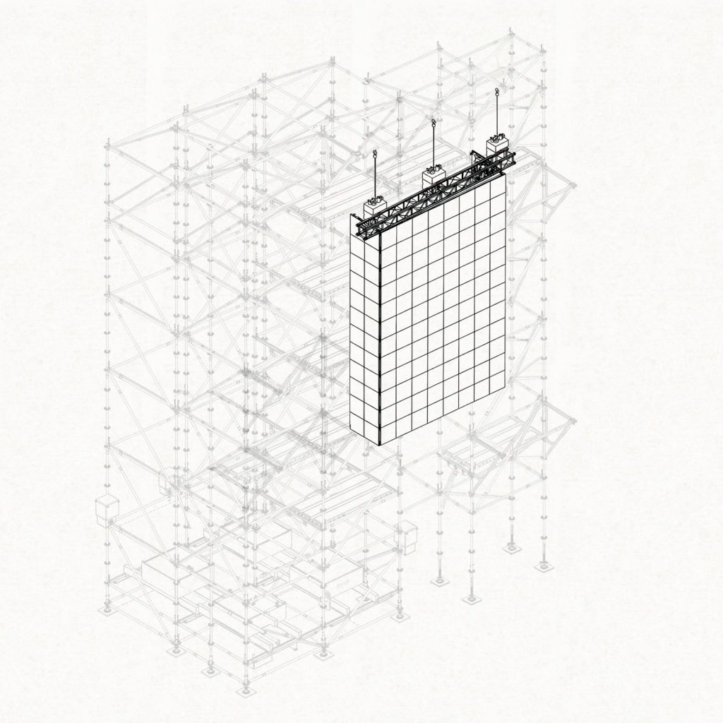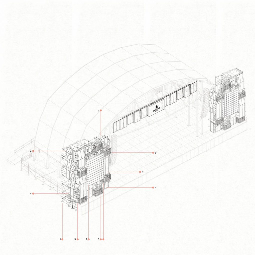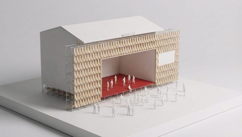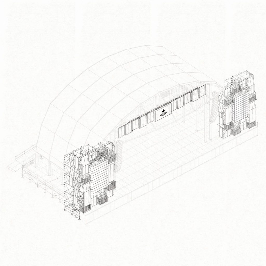 The repetition of the system creates a recognizable image at an urban scale while maintaining its domestic condition, producing a front that does not impose itself as an object but is perceived as part of a cultural continuity. The stage thus operates as an interface between audience and city, where architecture not only hosts the event but situates it within a shared memory.