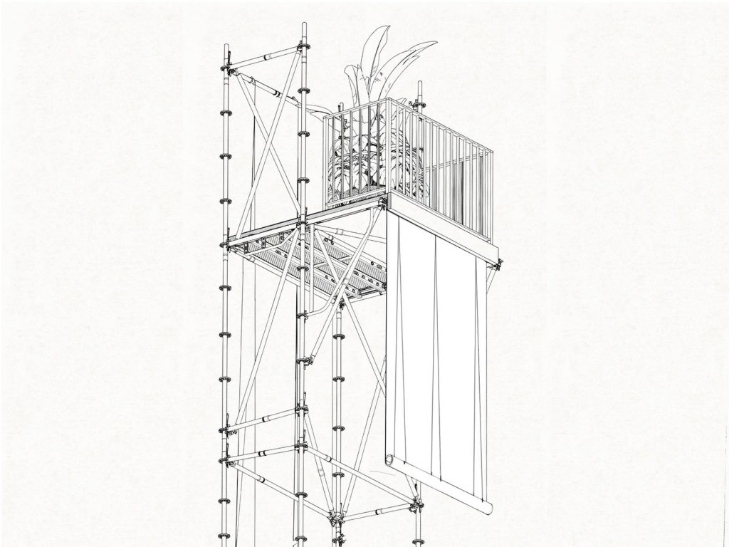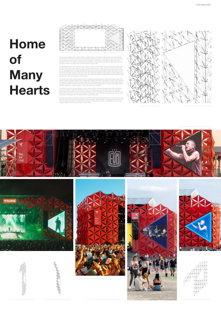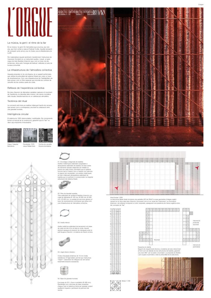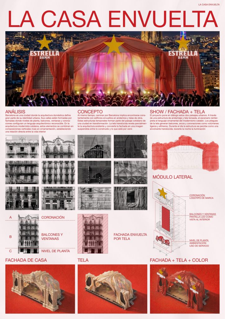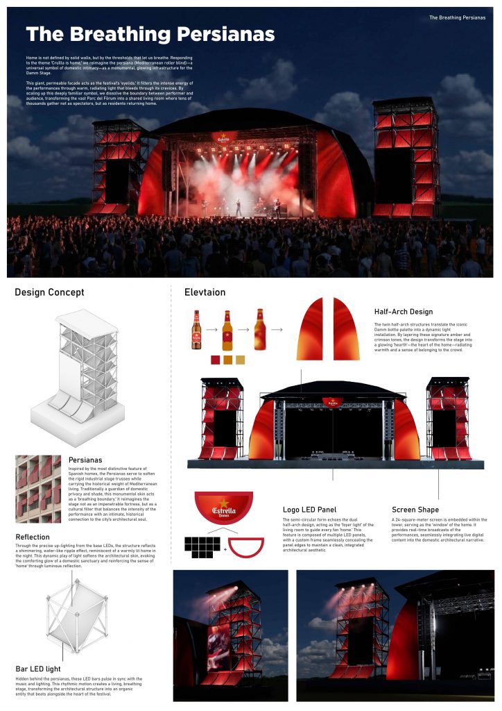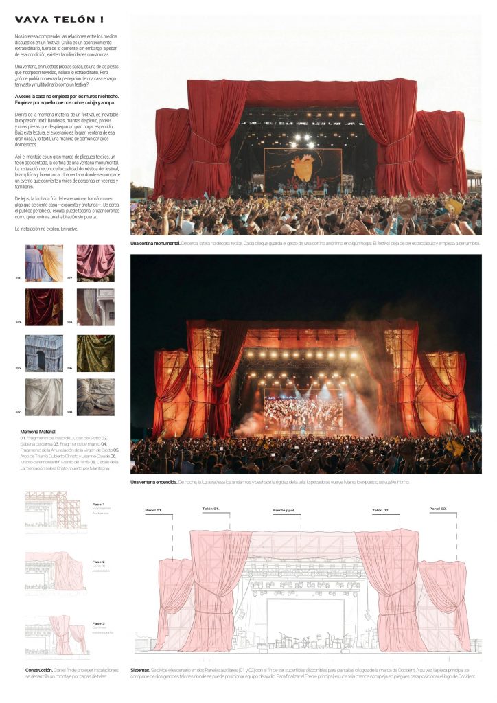 Through a system of overlapping red slats, the intervention generates depth, shade and movement, forming a living structure that responds to light, air and the rhythm of the festival. Inspired by the city’s balconies, the stage is conceived as an open house—a shared space where music is framed within an architecture connected to everyday imagery.