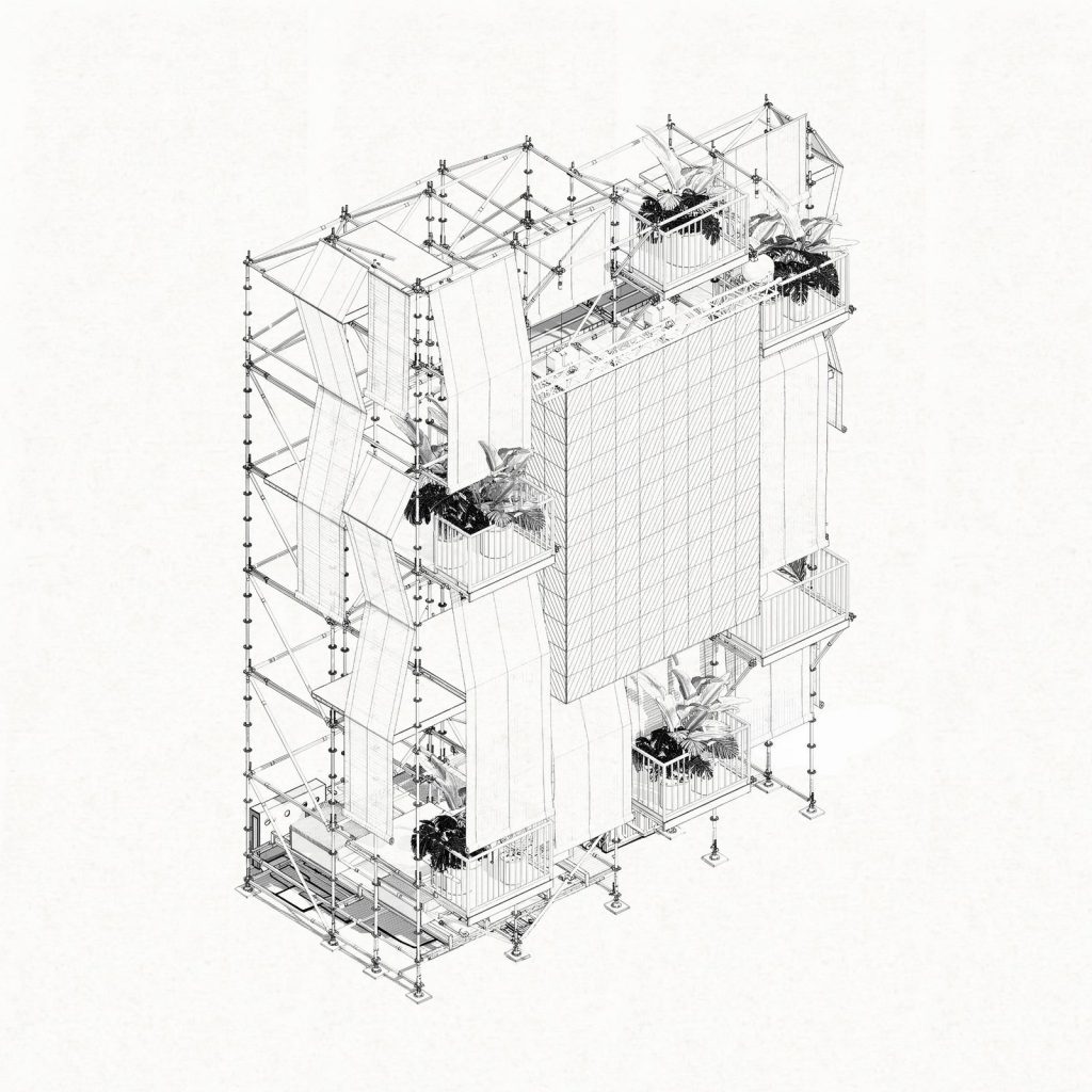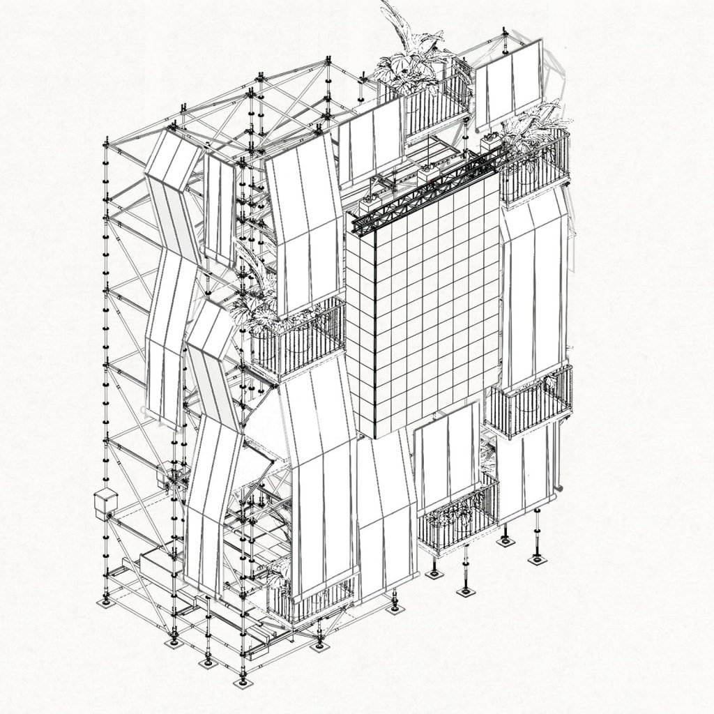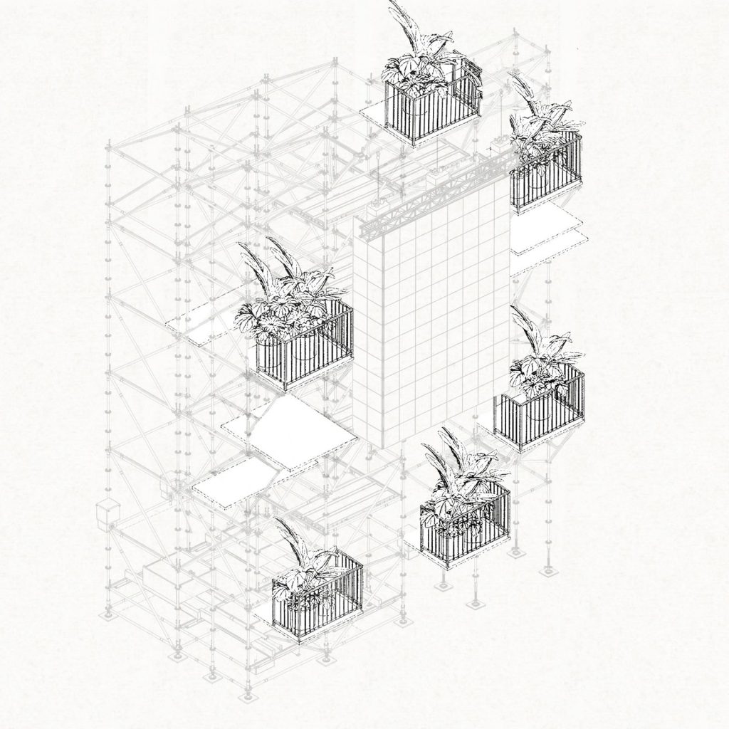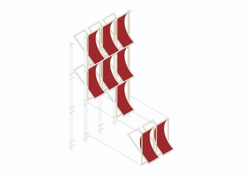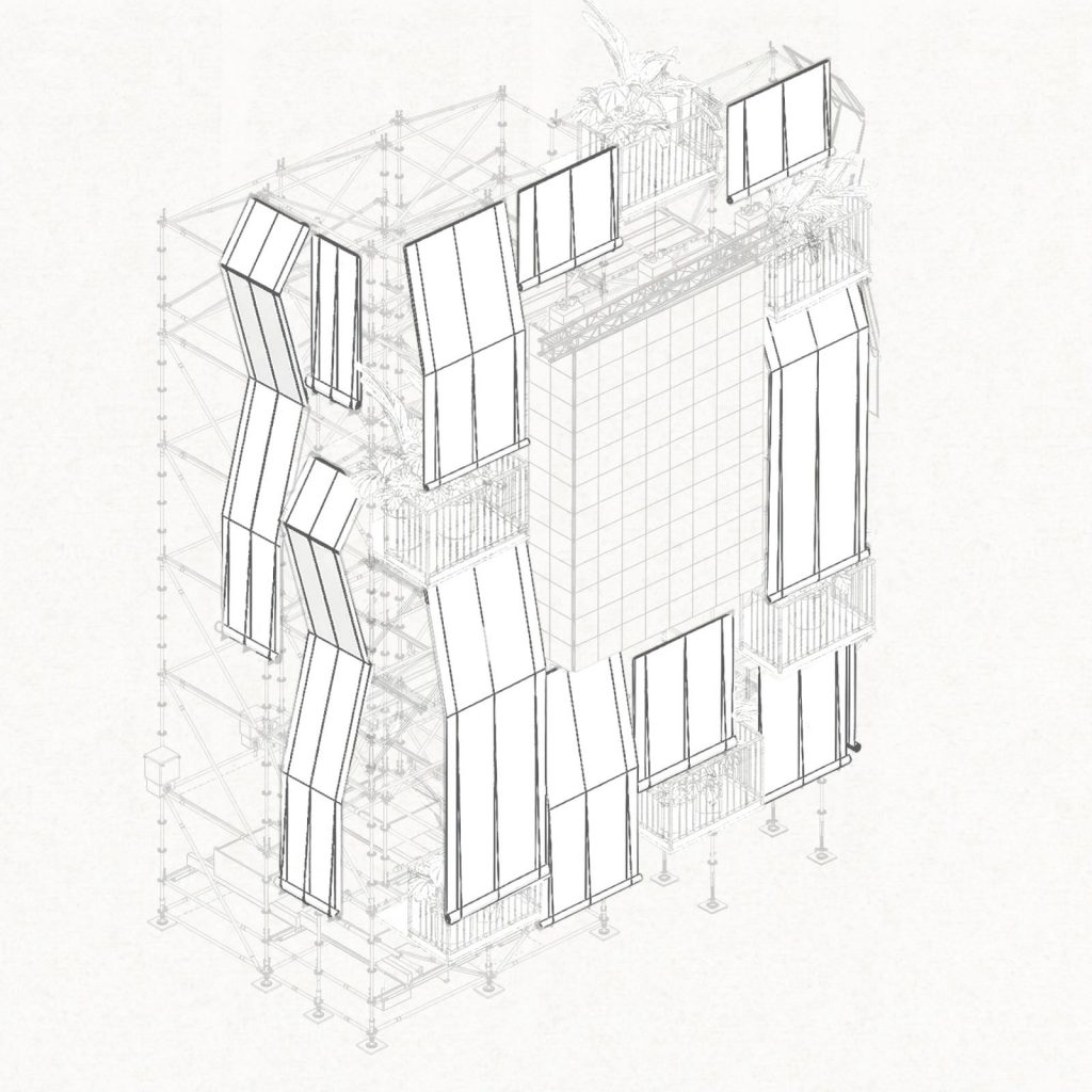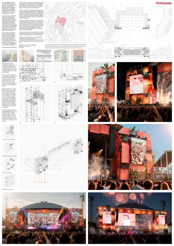 The Mediterranean city is not only understood from the street, but also from its balconies—intermediate spaces where the domestic and the collective meet. The proposal takes the persiana (traditional shutter) as a characteristic architectural element to construct a large scenographic façade that acts as a filter between interior and exterior.
