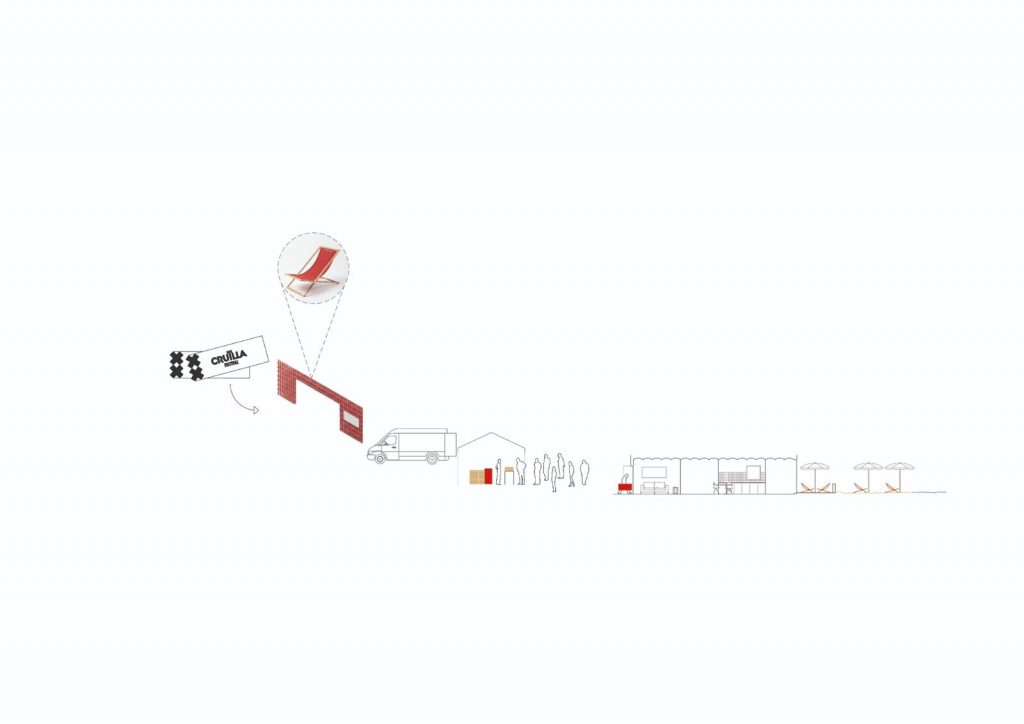 Beyond its physical presence, the chair acts as a symbol of comfort and belonging, introducing the idea of home through a direct and recognizable approach. The lightweight, demountable construction system allows all elements to be reused after the festival, extending their life beyond the event.